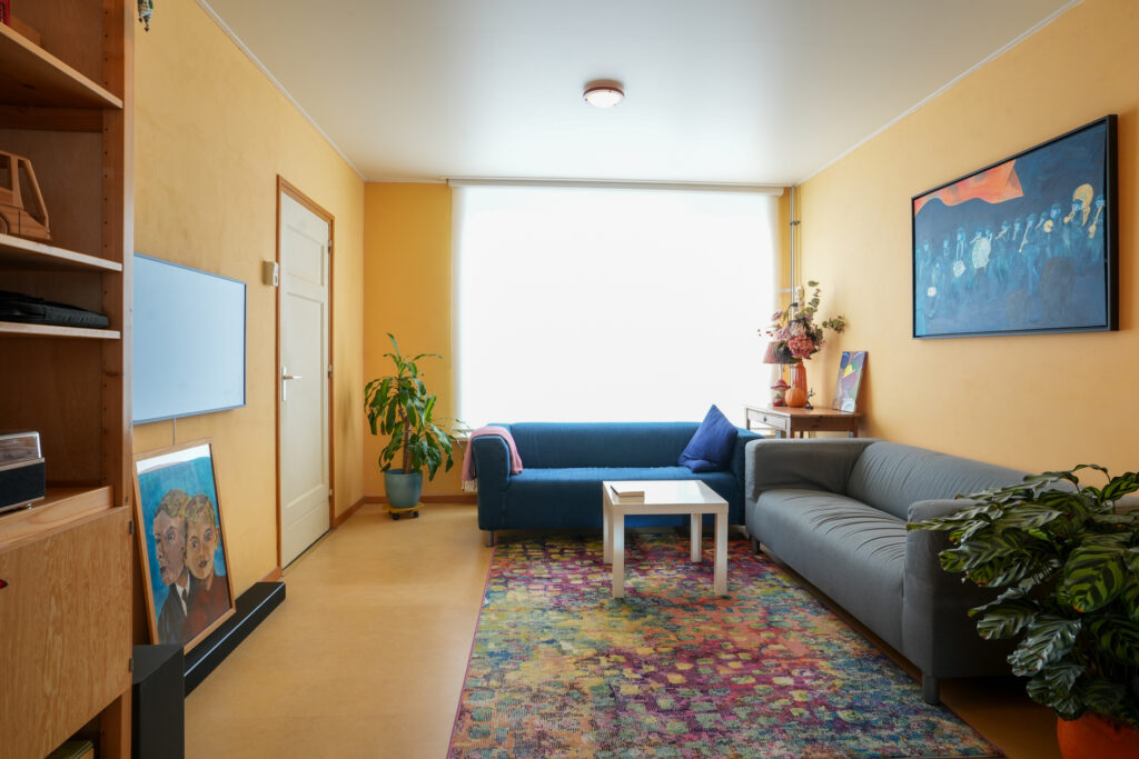 De woonkamer, eetkamer en keuken zijn voorzien van klikmarmoleum